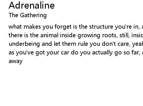 | what makes you forget is the structure you're in, all your life can't you feel there is the animal inside growing roots, still, inside your mind suppress your underbeing and let them rule you don't care, yeah you don't give a damn as long as you've got your car do you actually go so far, as giving in your adrenaline away |