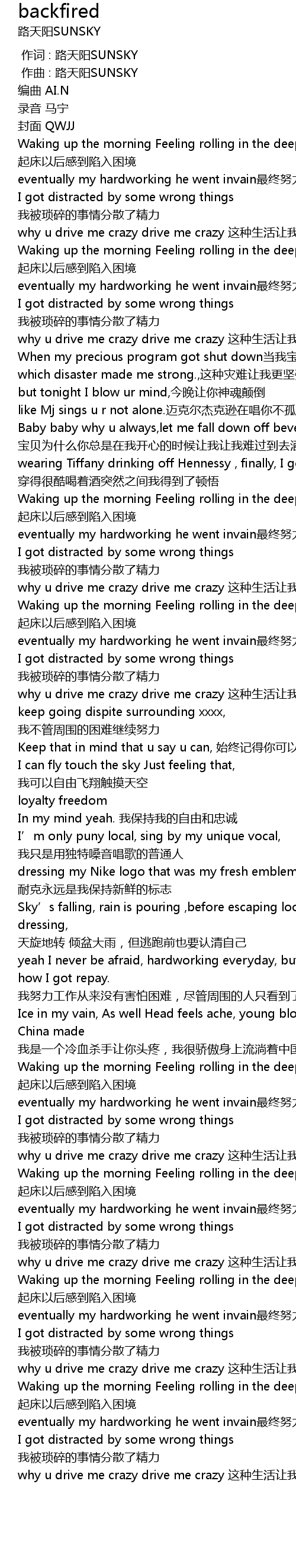 | [00:41.387] | why u drive me crazy drive me crazy zhè zhǒng shēng huó ràng wǒ fēng kuáng |