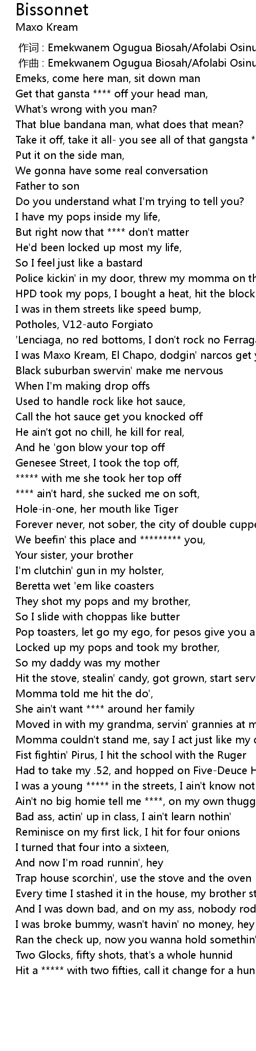 | [00:40.32] | I was Maxo Kream, El Chapo, dodgin' narcos get you knocked off |