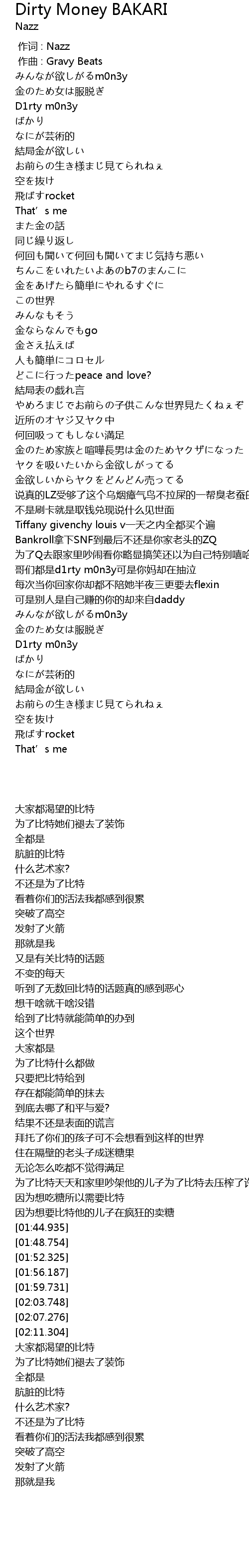 | [02:03.748] | gē men dōu shì d1rty m0n3y kě shì nǐ mā què zài chōu qì |