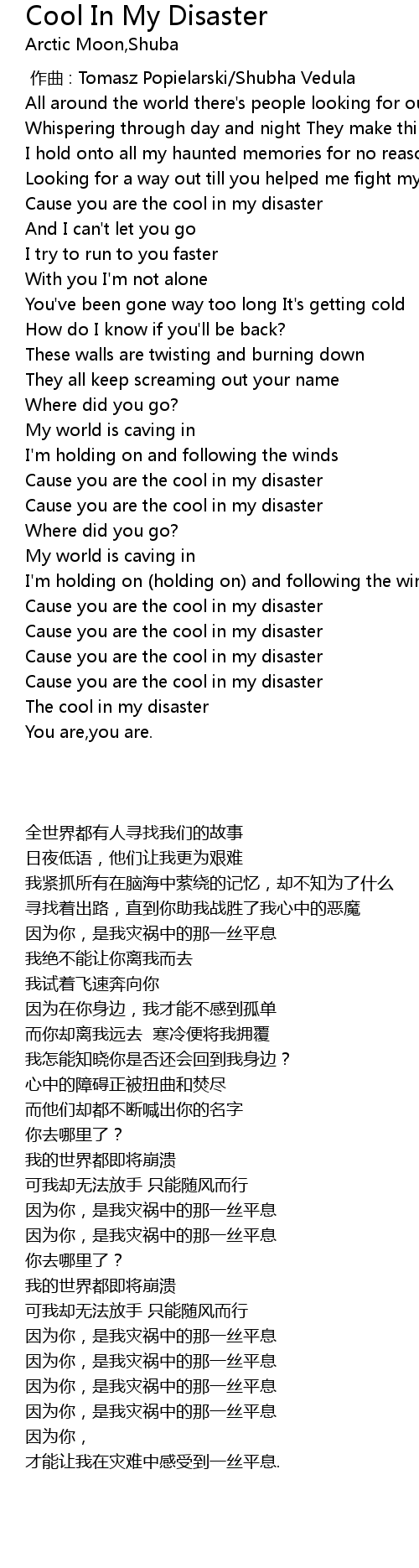 | [2:19.30] | Cause you are the cool in my disaster |