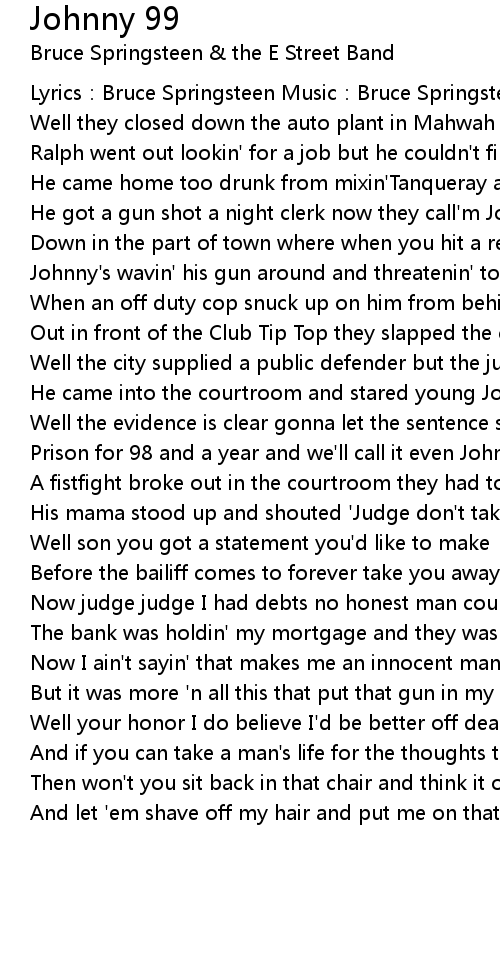 | He got a gun shot a night clerk now they call'm Johnny 99 | |