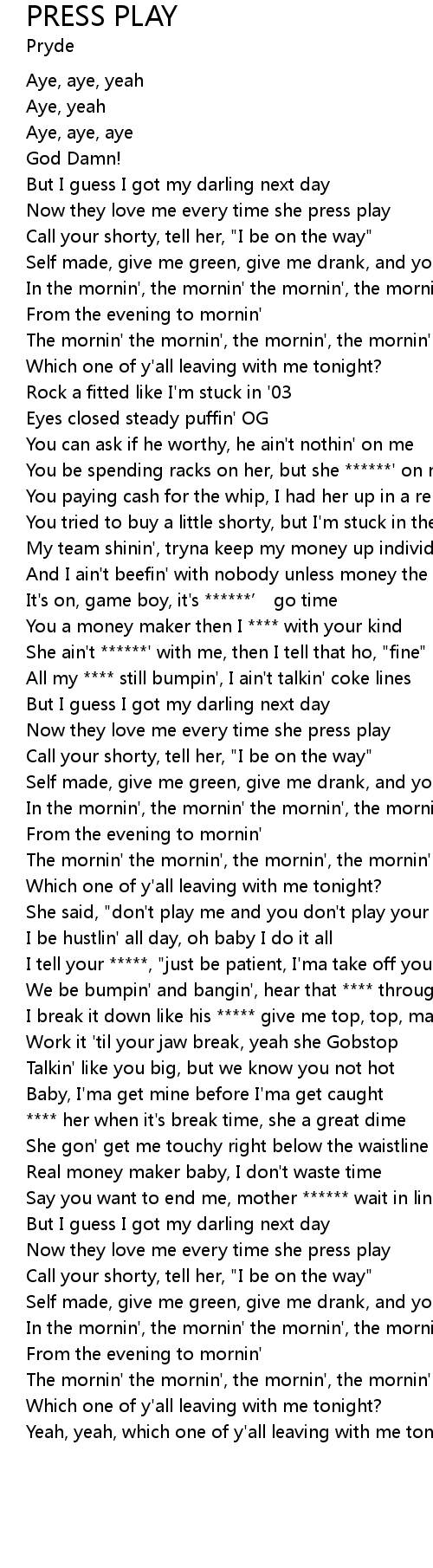 | [00:54.91] | She ain't ******' with me, then I tell that ho, "fine" |