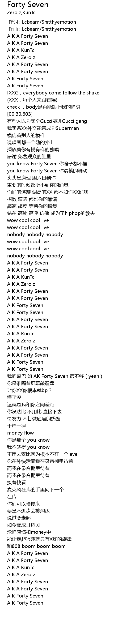 | [00:46.345] | you know Forty Seven nǐ shà zǐ dōu bù dǒng |