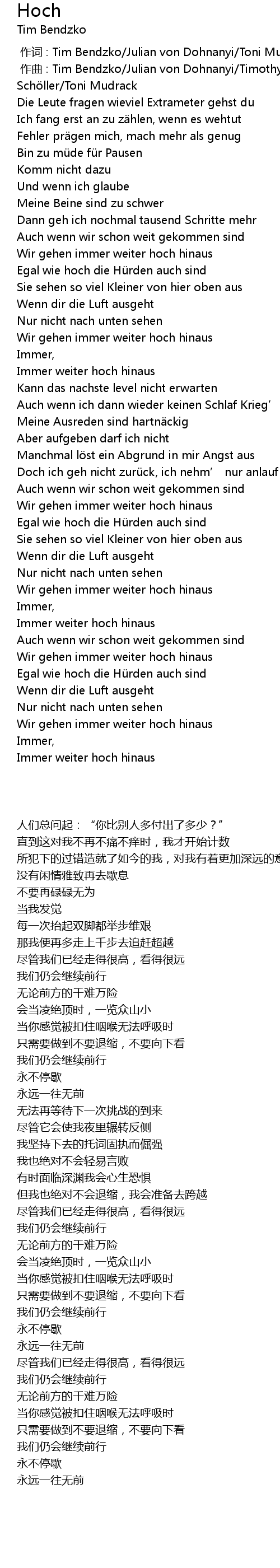 | [00:01.00] | zuò qǔ : Tim Bendzko Julian von Dohnanyi Timothy Auld Benedikt Sch ller Toni Mudrack |