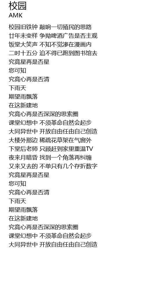| [00:16.33] | 校园旧铁钟 敲响一切殖民的思路 |