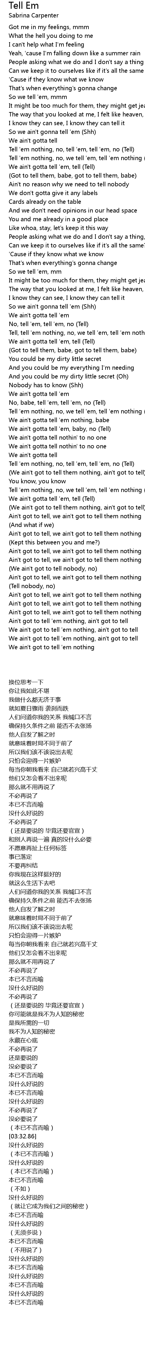 [02:33.29] Tell, tell 'em nothing, no, we tell 'em, tell 'em nothing (Tell)