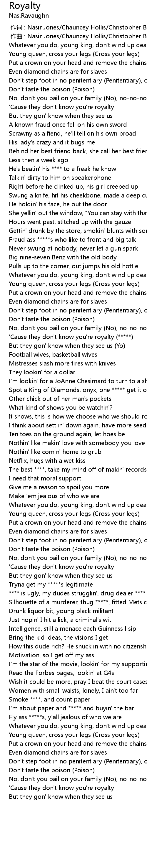 | [01:57.48] | 'Cause they don't know you're royalty (*****) |