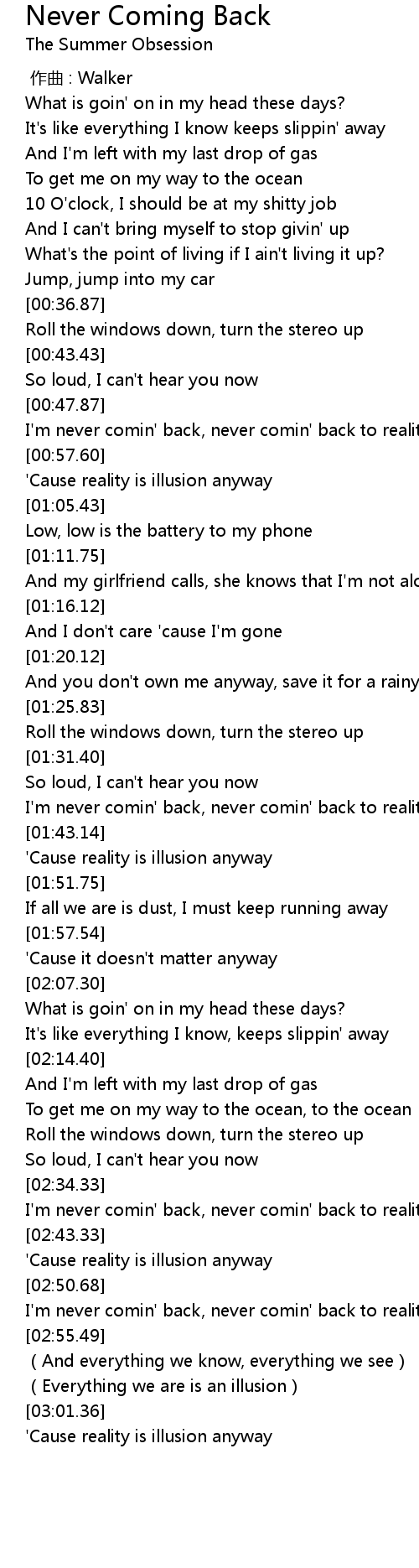 | [02:51.29] | I'm never comin' back, never comin' back to reality |
