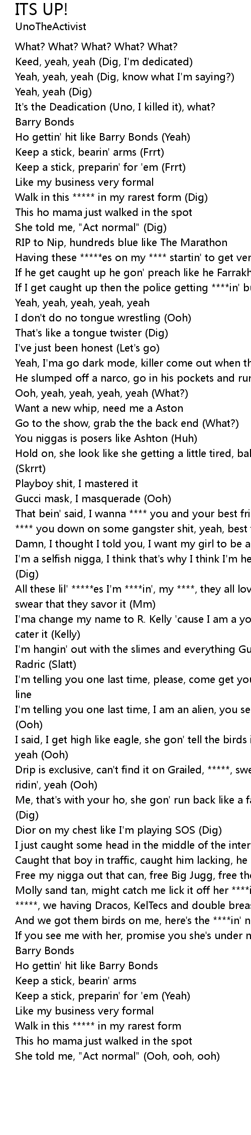 | [01:11.746] | All these lil' *****es I'm ****in', my ****, they all love it, I swear that they savor it (Mm) |