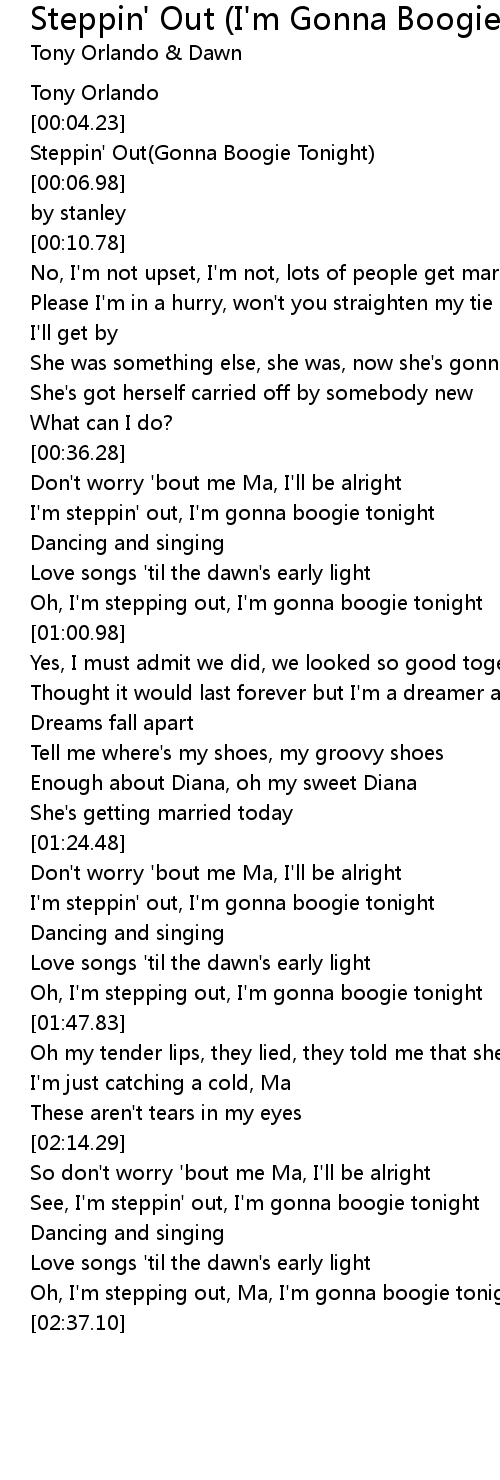 [02:19.89] See, I'm steppin' out, I'm gonna boogie tonight