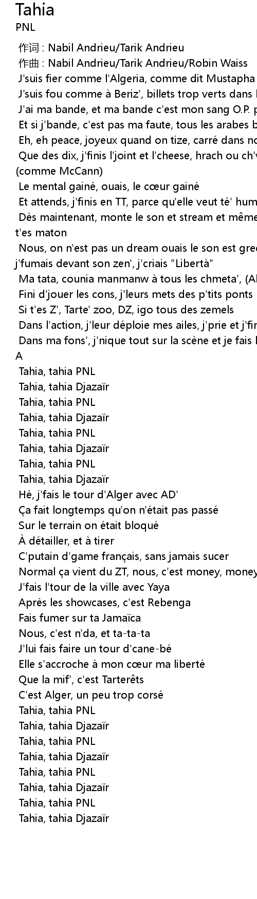 | [00:00.000] | zuo ci : Nabil Andrieu Tarik Andrieu |