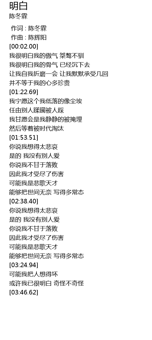| [03:34.70] | 或许我已很明白 奇怪不奇怪 |