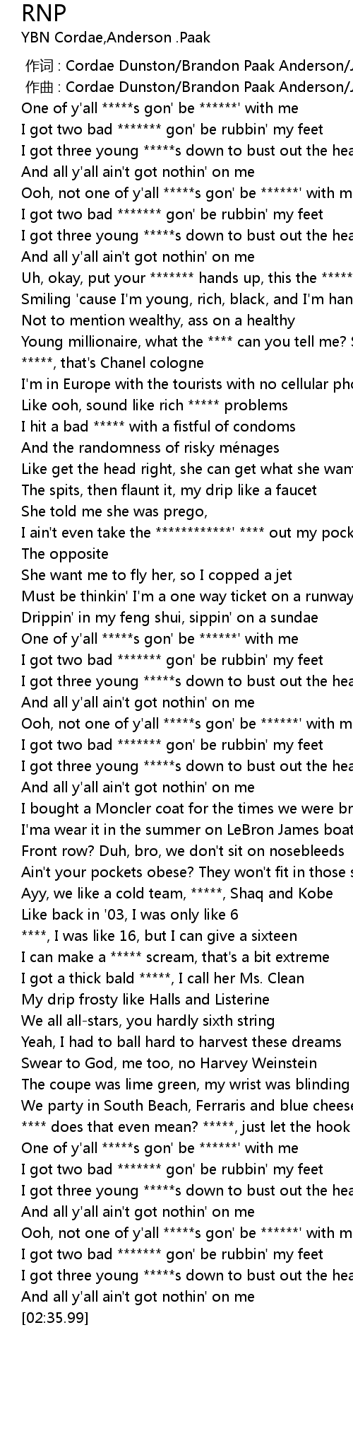 | [02:18.54] | I got two bad ******* gon' be rubbin' my feet |