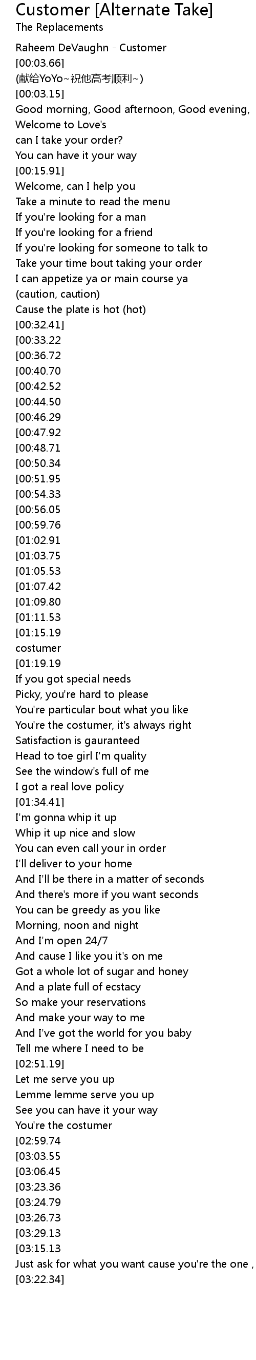 | [02:01.62][00:59.76] | Just ask for what you want cause your the costumer |