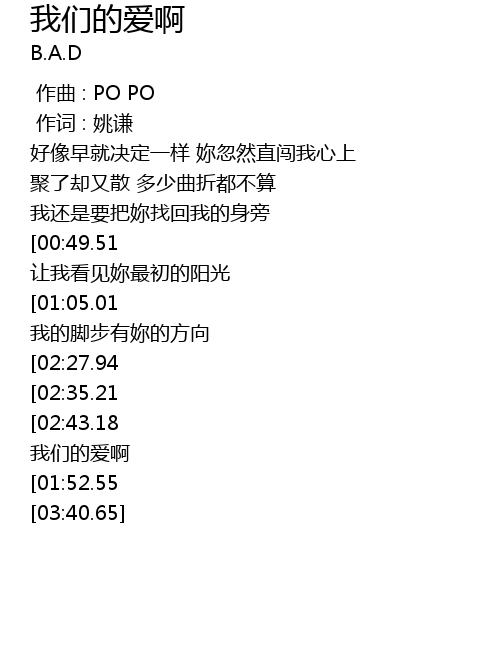 | [01:55.98][00:49.51] | 让我挥去妳眼中的忧伤 让我看见妳最初的阳光 |