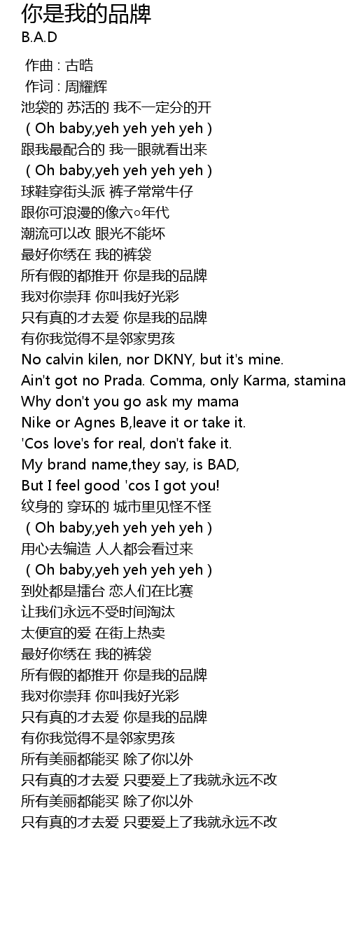 | [00:59.92] | 所有假的都推开 你是我的品牌 |