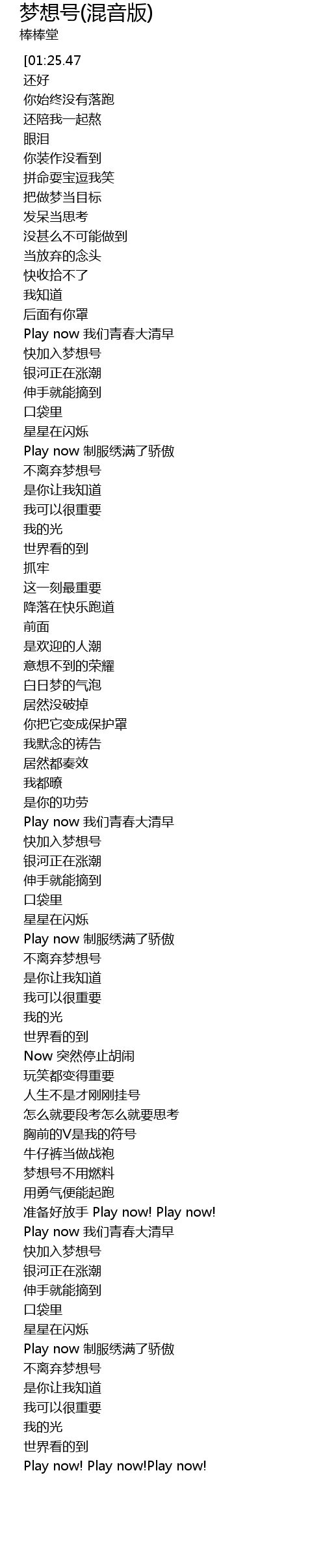 | [03:48.64] [01:25.47] [00:00.00] | 棒棒堂 - 梦想号(Edwin广告主题曲) |