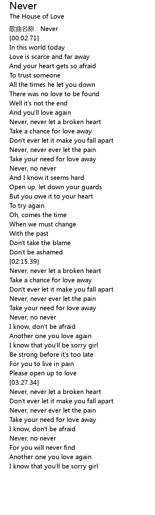 | [00:01.69] | gē qǔ míng chēng: Never |