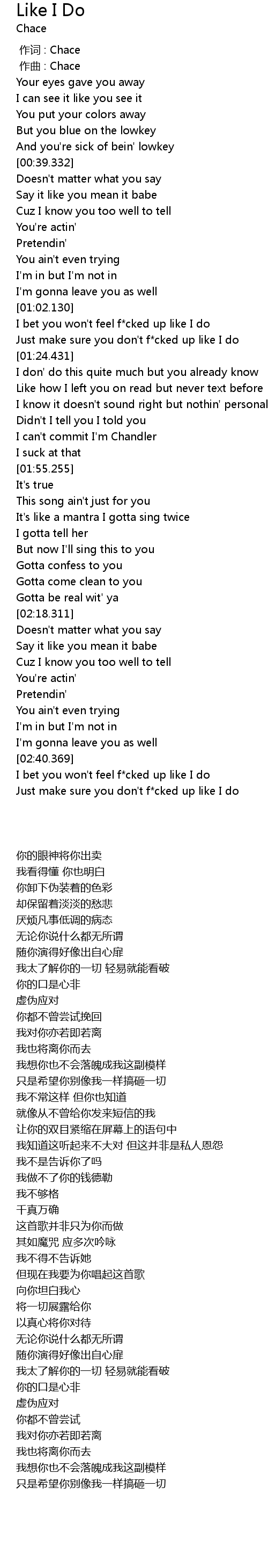 | [00:00.000] | 作词 : Chace |
