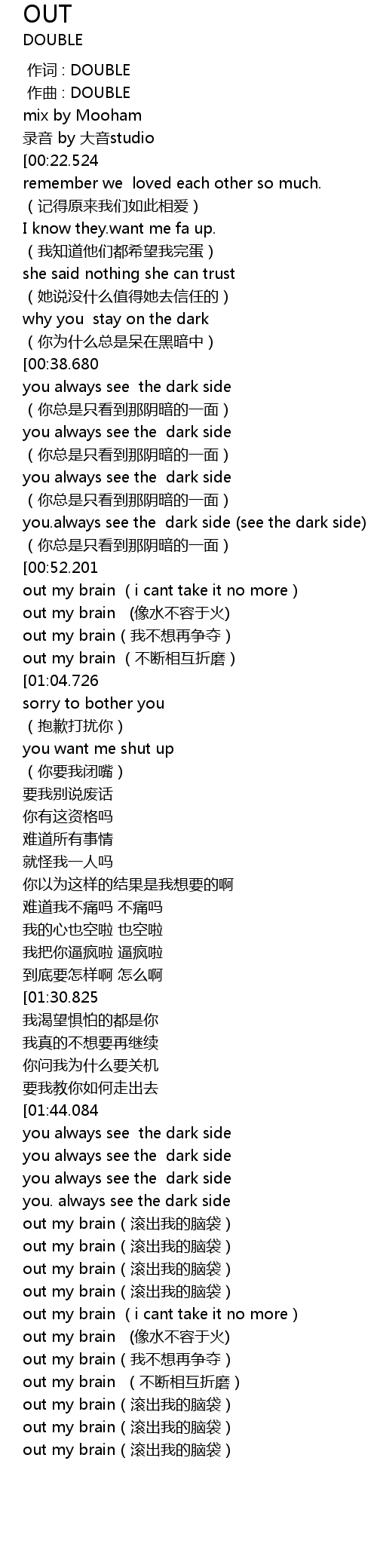 | [02:22.318] | out my brain bu duan xiang hu zhe mo |