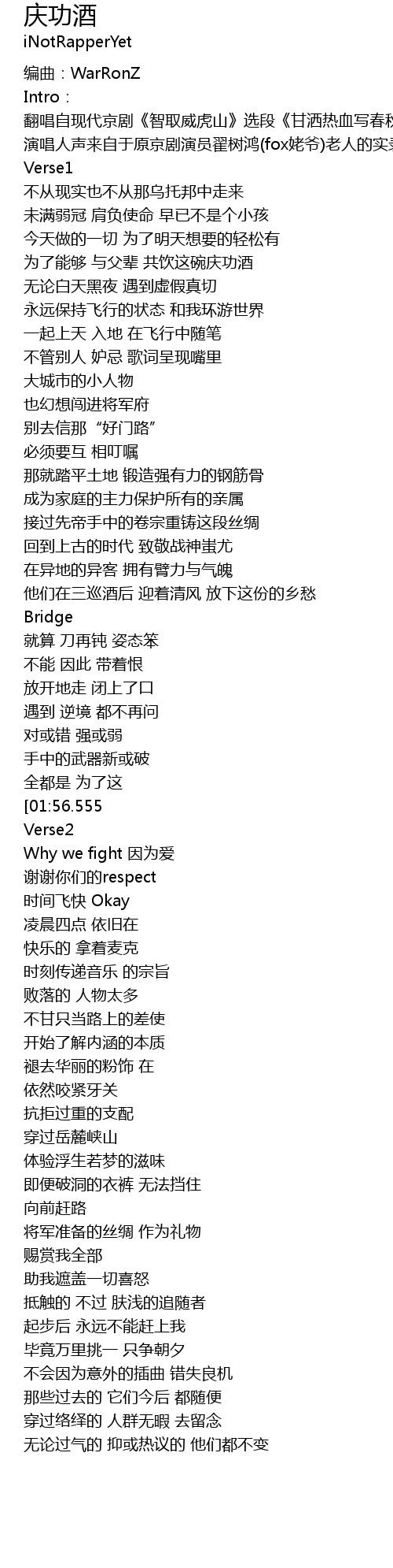 | [00:11.426] | 演唱人声来自于原京剧演员翟树鸿(fox姥爷)老人的实录。 |