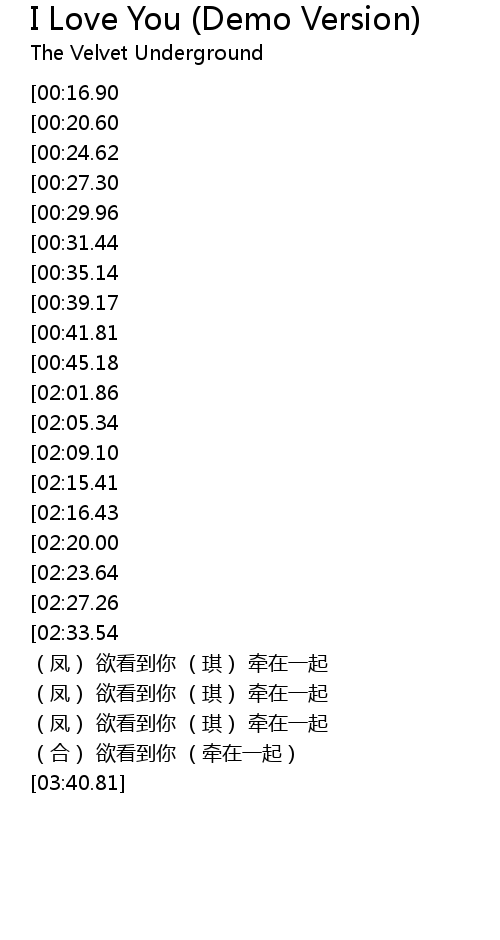 | [03:17.05] | (凤) 欲看到你 (琪) 牵在一起 |