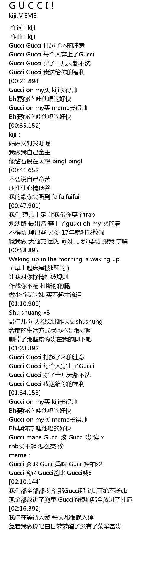 | [01:58.897] | Gucci diē dì Gucci mā mī Gucci duǎn xiù x2 |