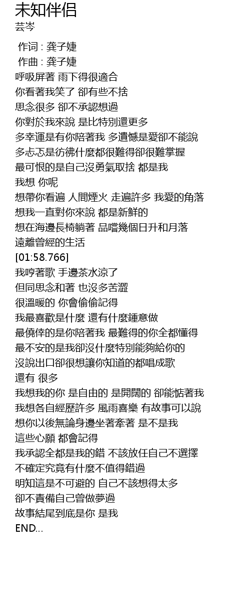 | [01:01.160] | 多幸運是有你陪著我 多遺憾是愛卻不能說 |
