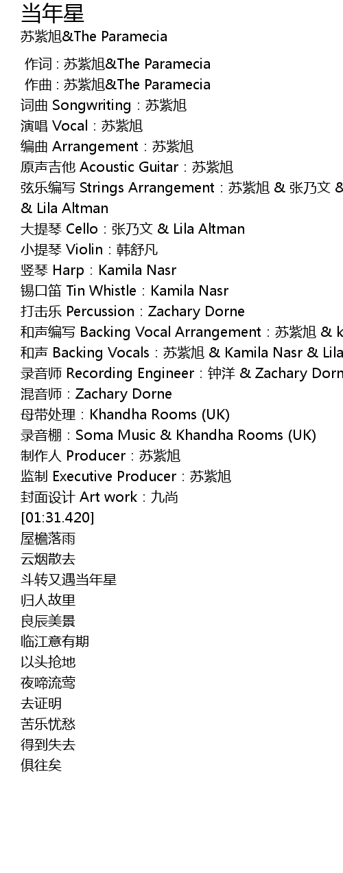 | [00:26.671] | 弦乐编写 Strings Arrangement:苏紫旭 & 张乃文 & 韩舒凡 & Lila Altman |