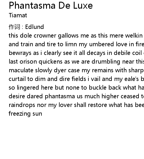 | this dole crowner gallows me as this mere welkin hallowed be whereupon i trick and train and tire to limn my umbered love in fire before this noble mare bewrays as i clearly see it all decays in debile coil of smoke suspires may our last orison quickens as we are drumbling near this poize of free quell me maculate slowly dyer case my remains with sharpened brier atone me to my throes curtail to dim and dire fields i vail and my eale's but a slumbering lier then so lingered here but none to buckle back what had begun in molten aeons caged desire dared phantasma us much higher ceased to milch the clover flower neither raindrops nor my lover shall restore what has been done when we're all keeled in freezing sun |