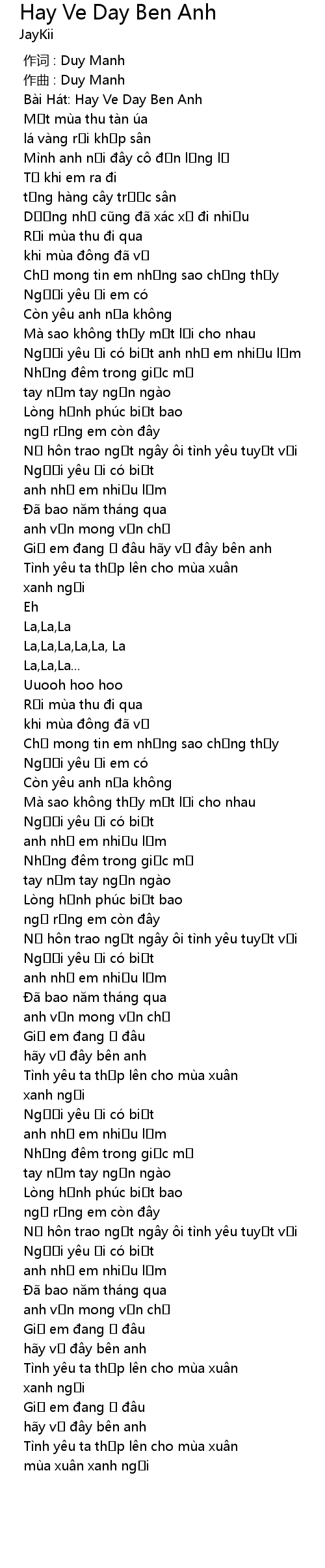 | [00:03.444] | Bà i Há t: Hay Ve Day Ben Anh |