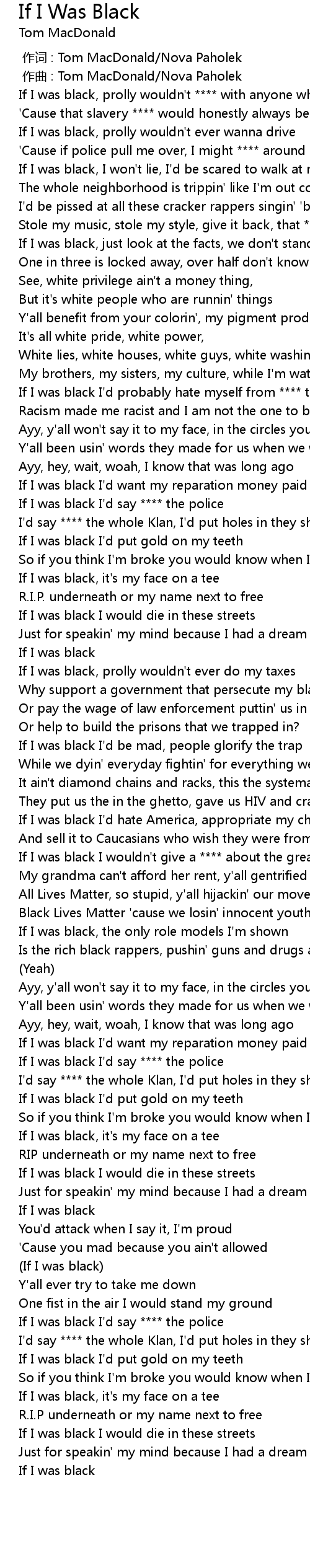 | [00:10.28] | If I was black, prolly wouldn' t with anyone who' s white |