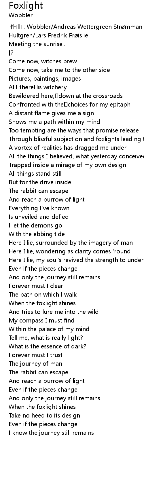 | [00:00.000] | 作曲 : Wobbler/Andreas Wettergreen Strømman Prestmo/Kristian Karl Hultgren/Lars Fredrik Frøislie |