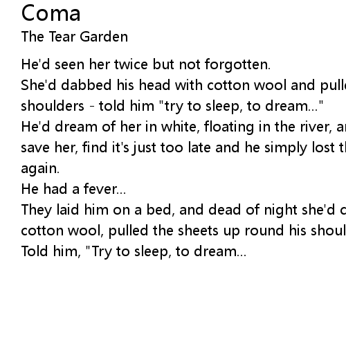 She'd dabbed his head with cotton wool and pulled the sheets up round his shoulders - told him "try to sleep, to dream..."