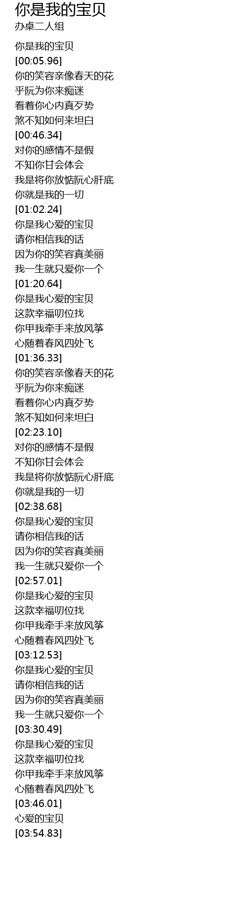 | [00:01.06] | nǐ shì wǒ de bǎo bèi |