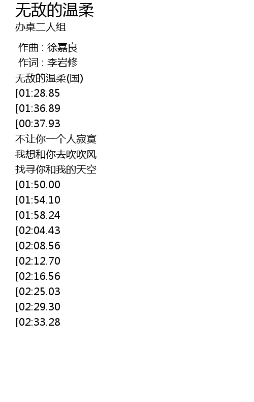 | [00:15.00][01:28.85][03:11.76] | 办桌二人组-无敌的温柔(国) |