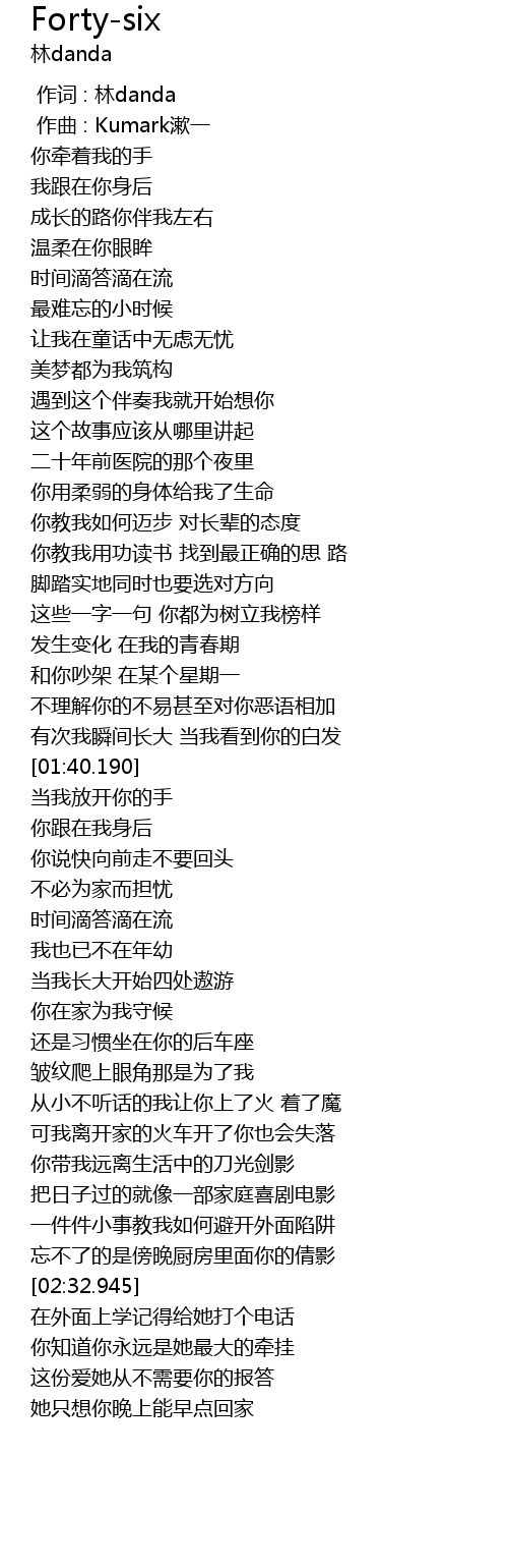 | [01:19.194] | 有次我瞬间长大 当我看到你的白发 |