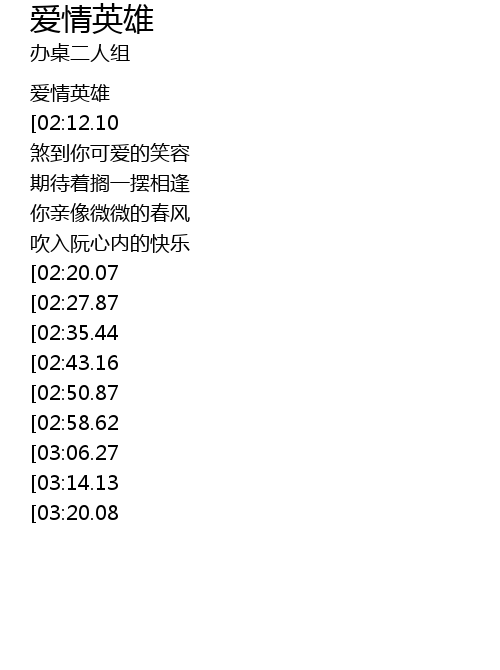 | [01:37.70][02:58.62][03:37.19] | 做你身边爱情英雄 |