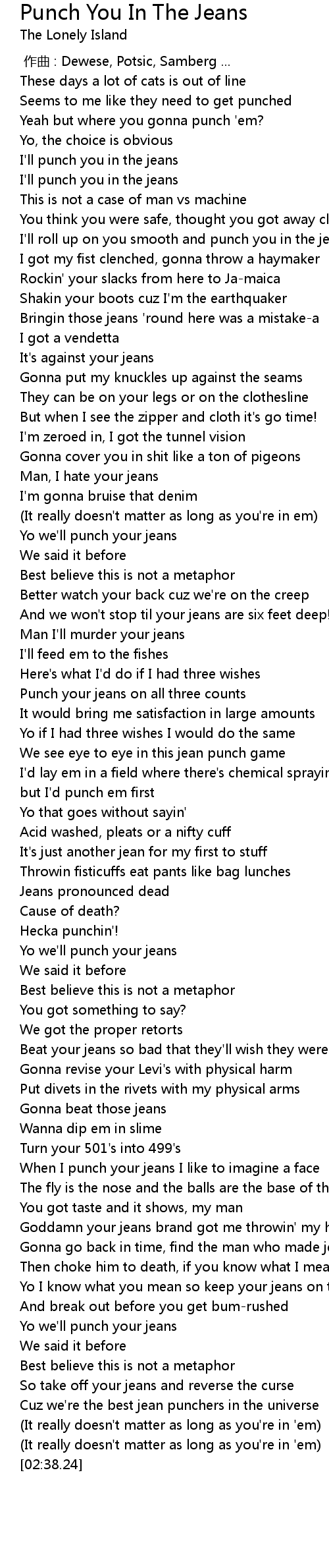| [01:57.00] | When I punch your jeans I like to imagine a face |