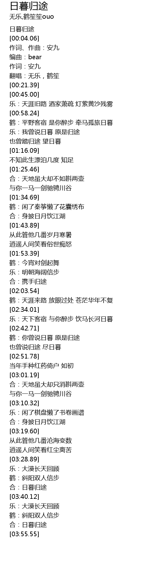 | [00:58.49] | 鹤:平野客宿 是你醉步 牵马孤旅日暮 |