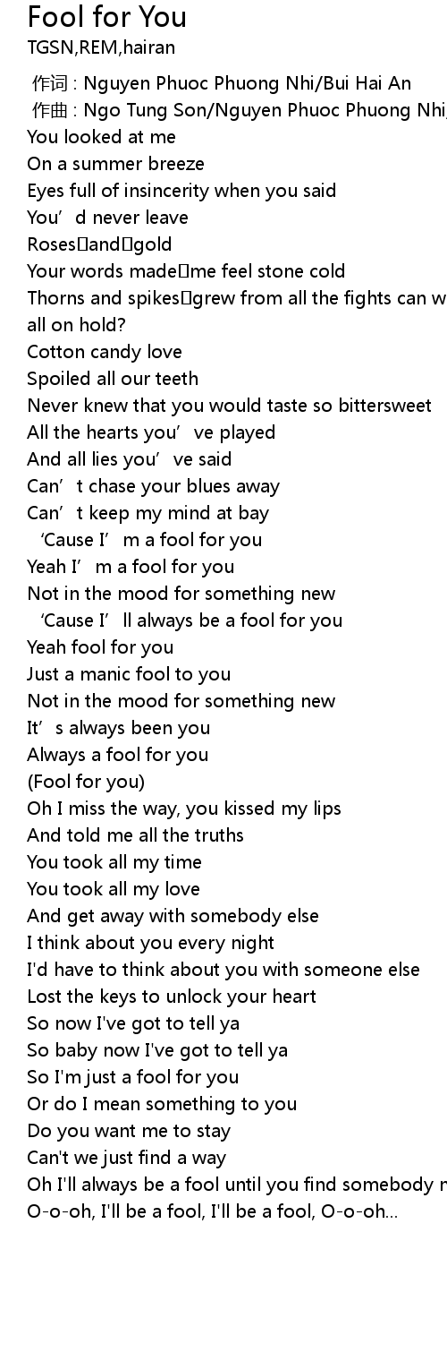 | [02:23.37] | Oh I' ll always be a fool until you find somebody new |