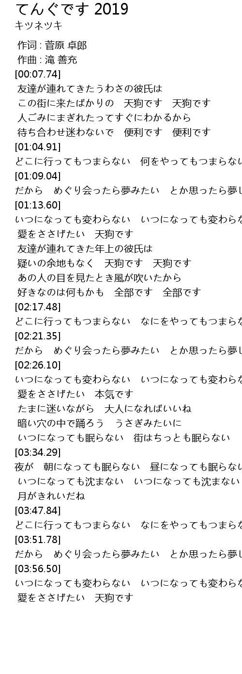 | [00:36.22] | この街に来たばかりの 天狗です 天狗です |