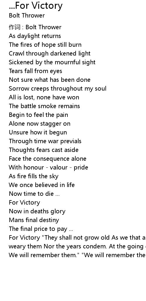 | For Victory "They shall not grow old As we that are left grow old Age shall not weary them Nor the years condem. At the going down of the sun And in the morning We will remember them." "We will remember them" |