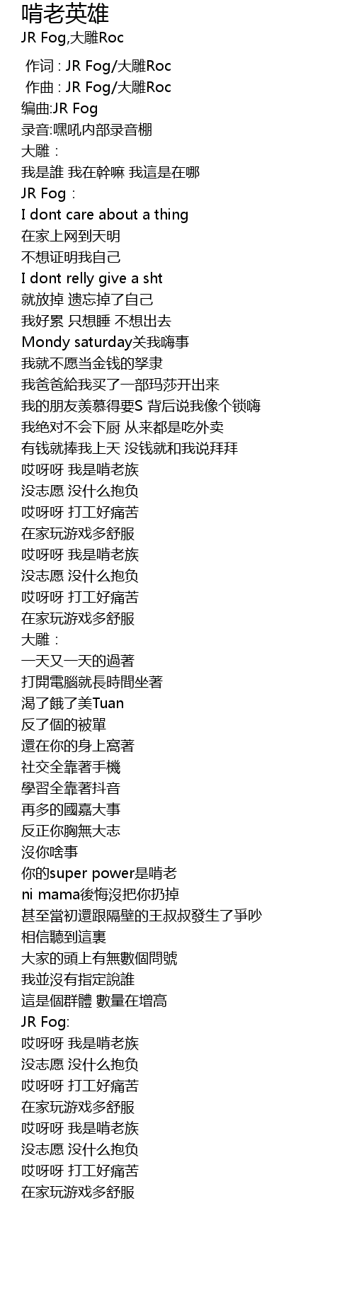 | [00:00.000] | 作词 : JR Fog/大雕Roc |