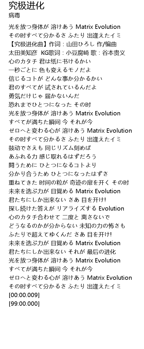 | [00:02.99] | 光を放つ身体が 溶けあう Matrix Evolution |