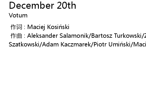 | [00:00.00-1] | 作曲 : Aleksander Salamonik/Bartosz Turkowski/Zbigniew Szatkowski/Adam Kaczmarek/Piotr Umiński/Maciej Kosiński |