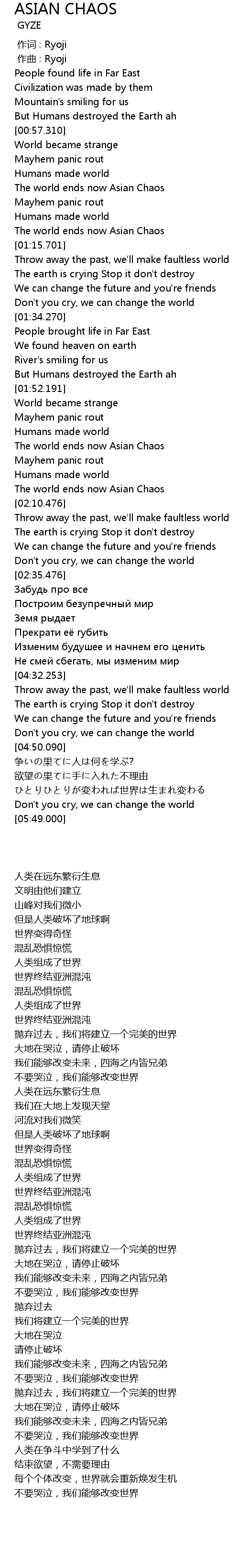 | [02:14.821] | The earth is crying Stop it don't destroy |