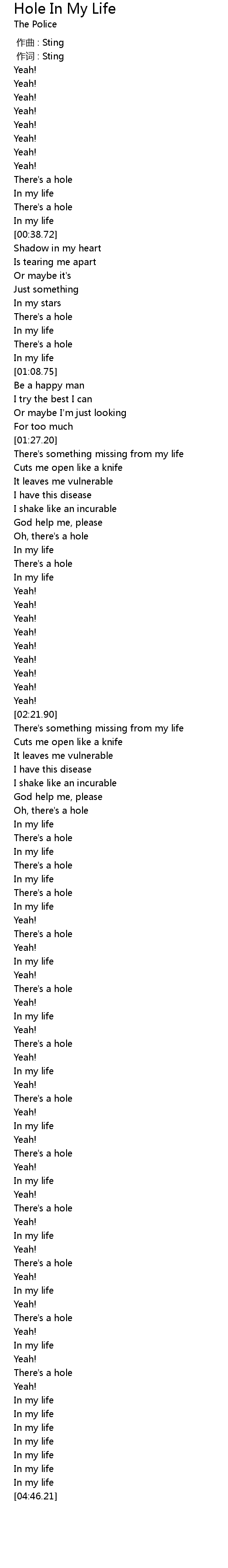 | [02:00.21] | There' s a hole |
