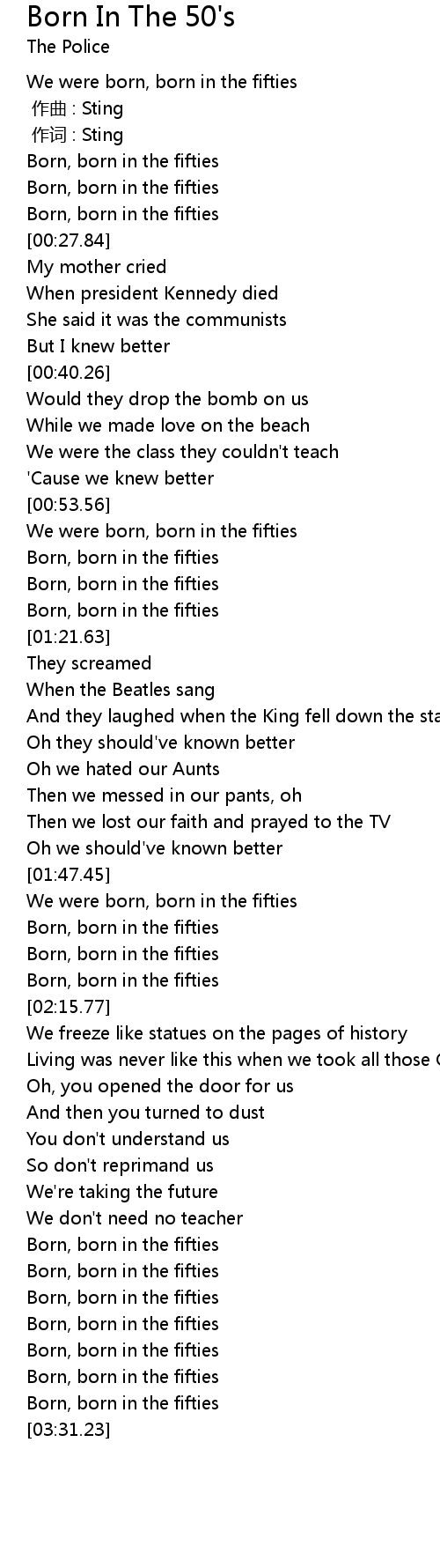 | [03:03.90] | Born, born in the fifties |
